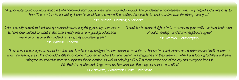"The diamond garden trellis panels we purchased are extremely high quality and the care and communication of the staff made an internet buy feel personal, thank you, we're very happy indeed."